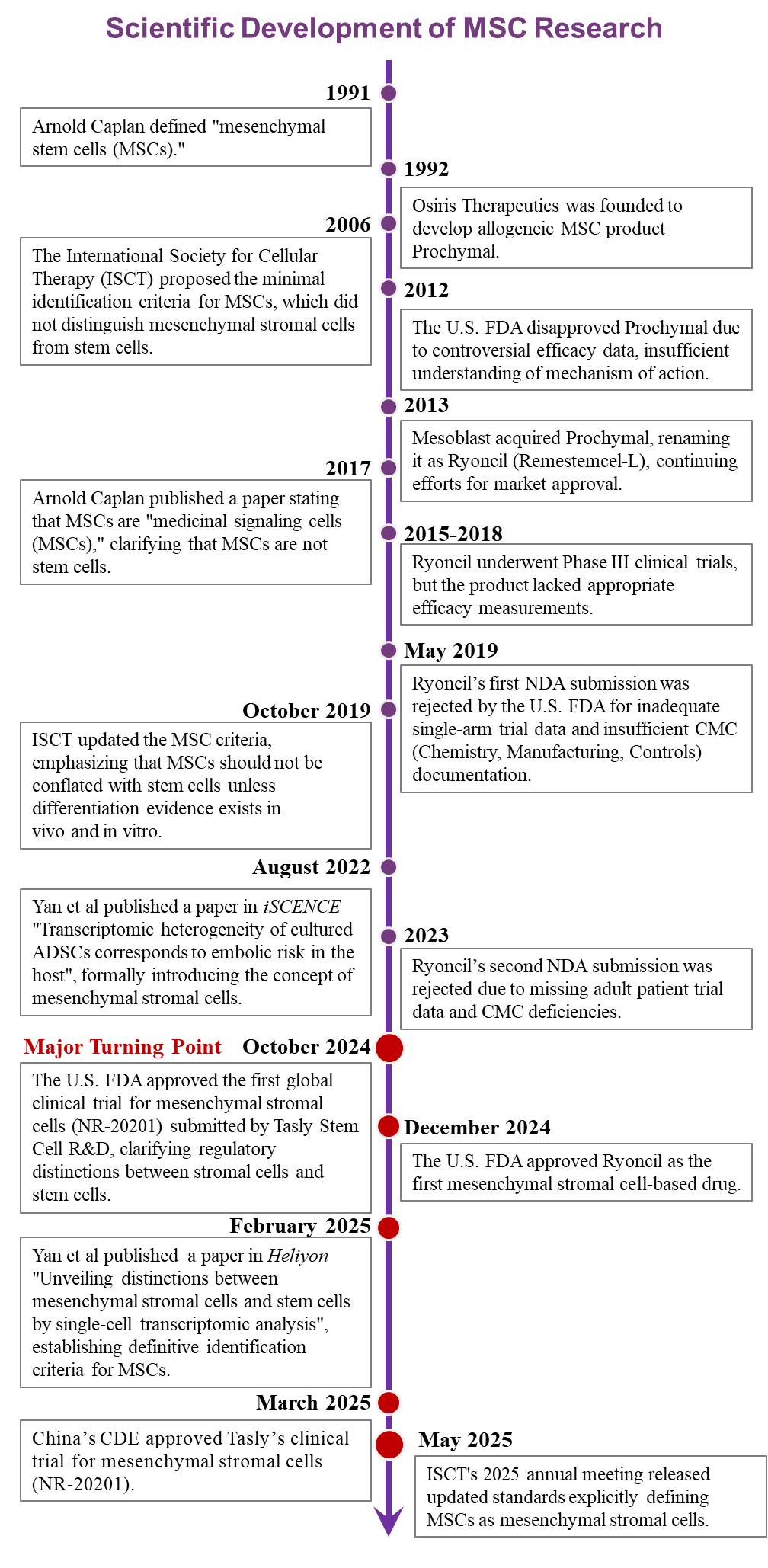 As scientific understanding has deepened, regulatory agencies have rapidly updated their perspectives on mesenchymal stromal cells (MSCs) versus mesenchymal stem cells. In October 2024, the U.S. FDA approved the world’s first MSC-based therapy with the explicit designation "mesenchymal stromal cells" in its Investigational New Drug (IND) application, submitted by Tasly Pharmaceutical’s research team [8]. Later that year, the FDA further granted approval to Ryoncil®, the first MSC drug to be officially classified as a "mesenchymal stromal cell therapy" [9]. These decisions marked a paradigm shift in regulatory recognition of MSCs.