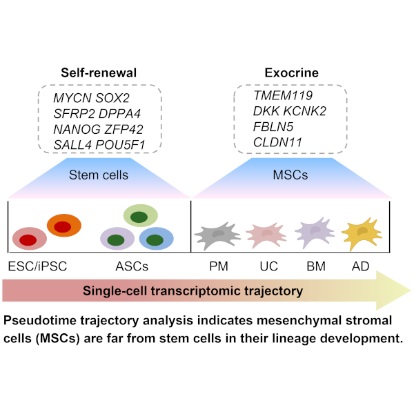 Using advanced single-cell RNA sequencing (scRNA-seq) and pseudotime trajectory analysis, the research group identified that stem cells exhibit robust self-renewal and differentiation capabilities while mesenchymal stromal cells (MSCs) lack the expression of these critical stemness genes. These genes include SOX2NANOGPOU5F1SFRP2DPPA4SALL4, ZFP42 and MYCN. On the other hand, there are five critical stromal cell functional genes, TMEM119FBLN5KCNK2CLDN11 and DKK1, that are only expressed in the mesenchymal stromal cells, not in stem cells.