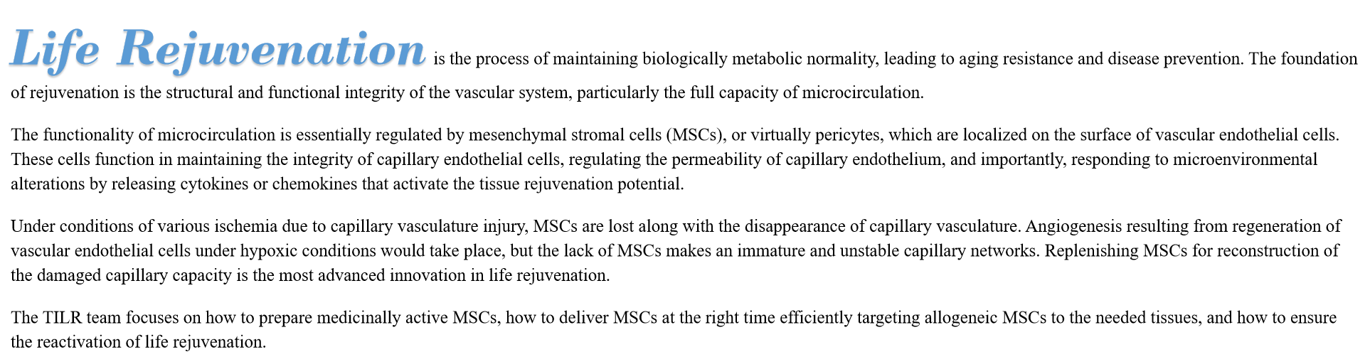 The TILR team focuses on how to prepare medicinally active MSCs, how to deliver MSCs at the right time efficiently targeting allogeneic MSCs to the needed tissues, and how to ensure the reactivation of life rejuvenation.