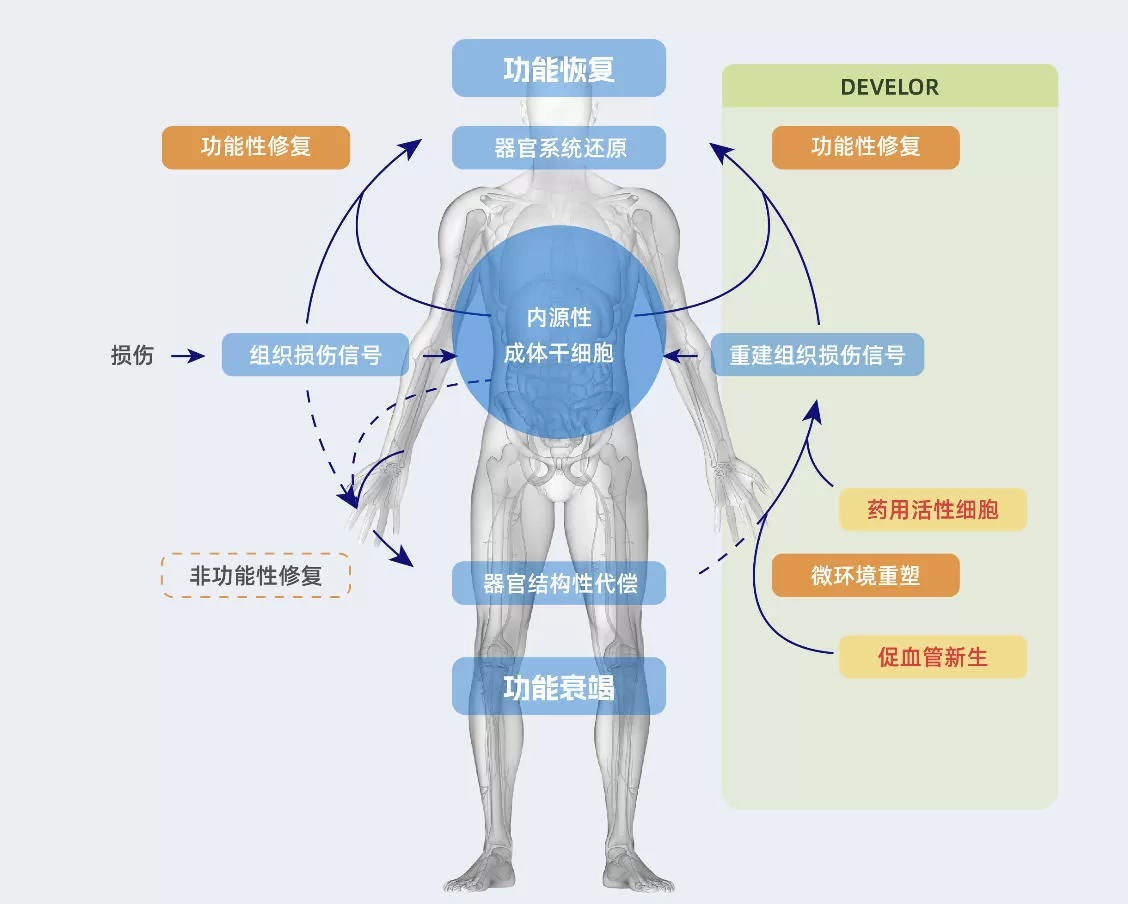 DEVELOR 是天士力还原医学工程院提出的核心策略框架,全称为 Destination-engaged and Vascular Evolving-Linked Organismal Rejuvenation,即“靶向导向与血管进化耦合的整体生命焕新”。 这一理念揭示了生命焕新的本质:细胞与组织的再生不仅依赖局部修复,更依托于血管系统的进化性重塑(vascular evolution),从而实现器官层面的功能再生与全身稳态的恢复。